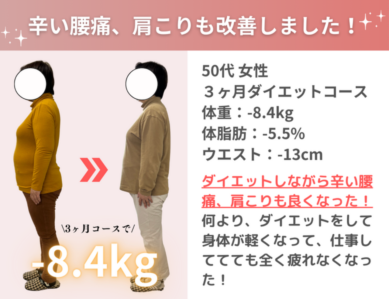 ・肩こりや腰痛などある方にはそちらの施術を行いダイエット中のストレスを軽減させ、睡眠の質などを良くしていきます。